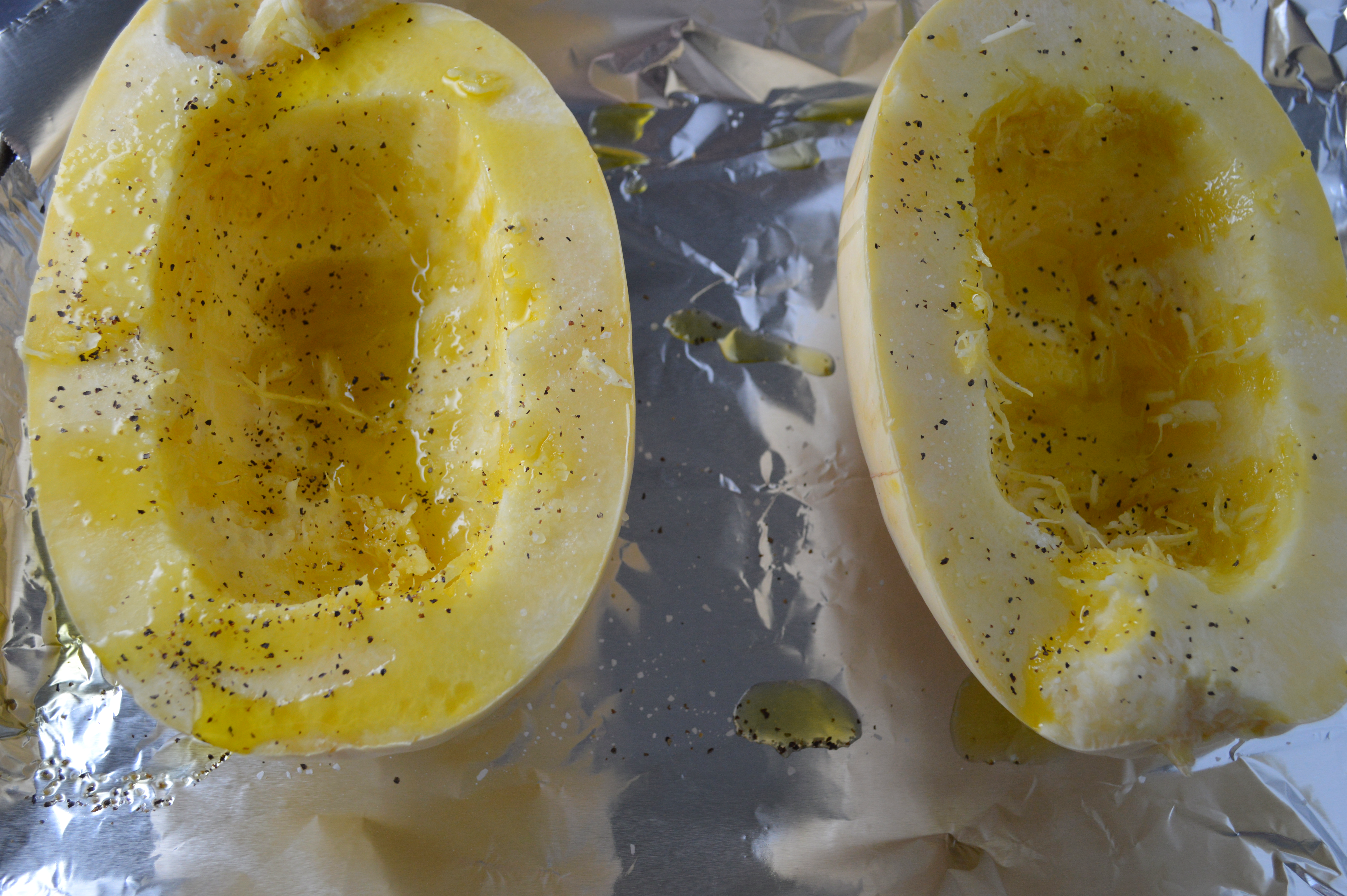 Cut the Spaghetti Squash in half lengthwise and remove the seeds with a spoon. Place the squash on a parchment or foil lined baking sheet. Sprinkle with salt and pepper. Drizzle with olive oil making sure the squash is coated. Add a splash of water. Bake in the oven for 40-50 minutes. Let cool and shred with a fork.