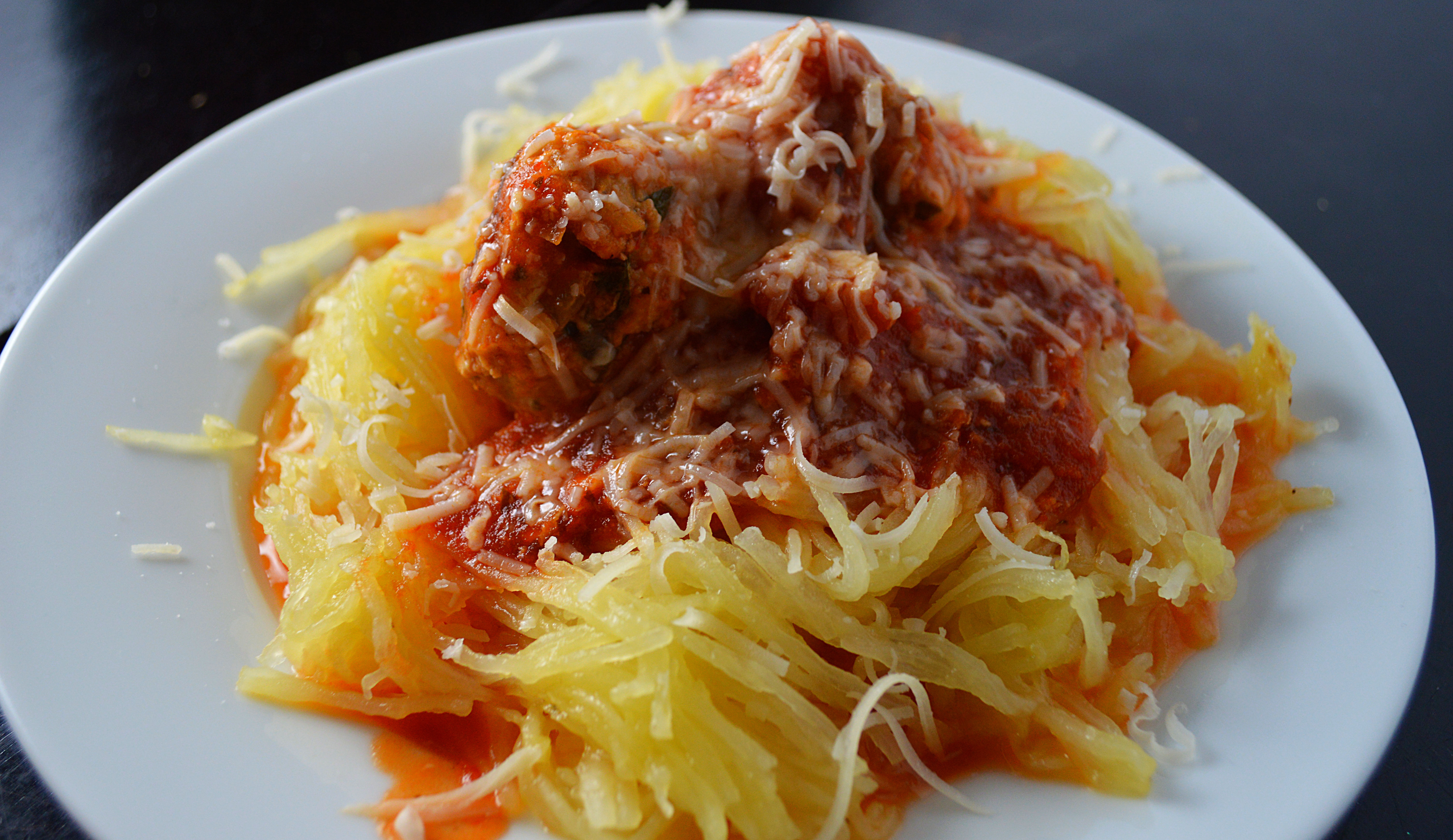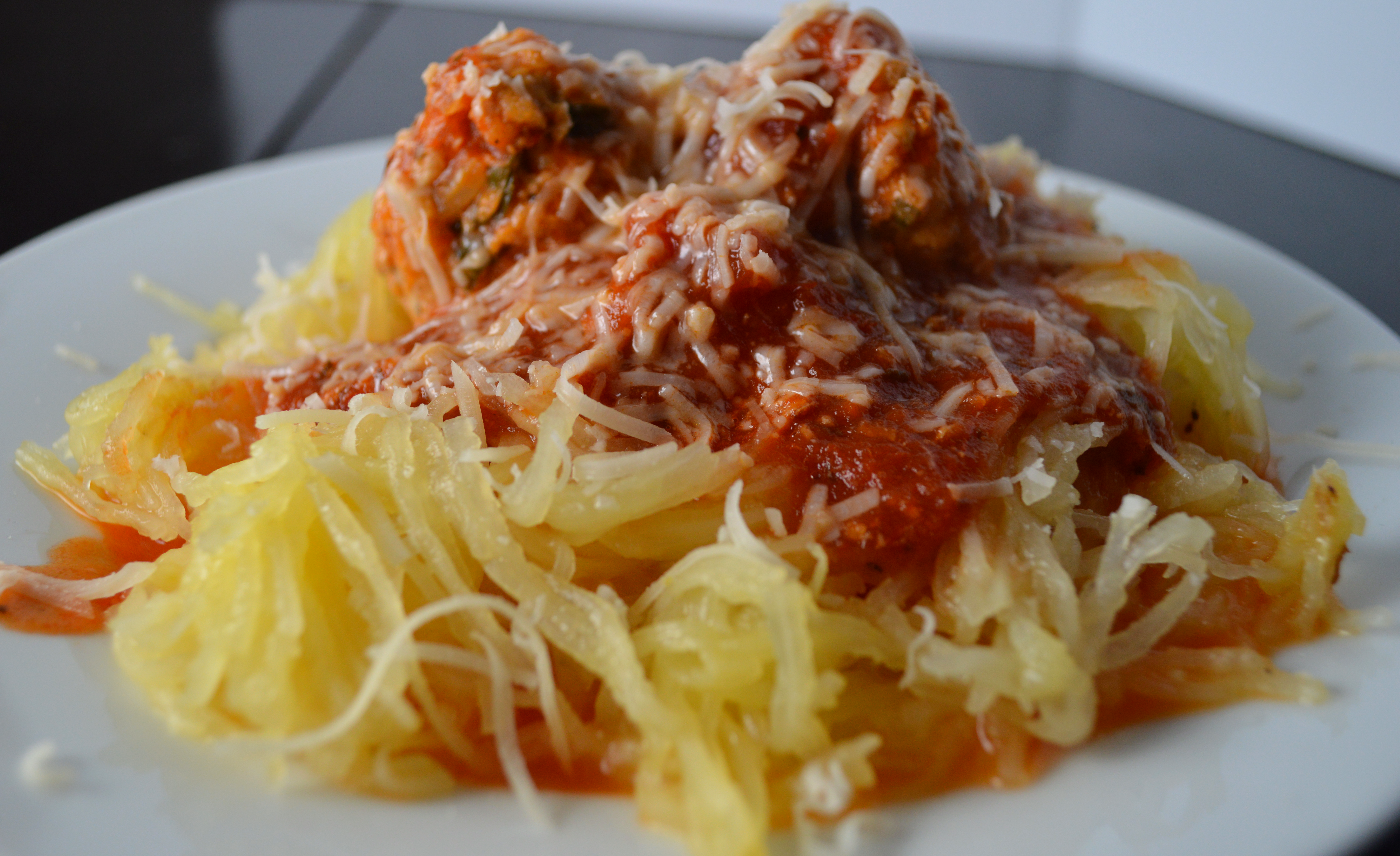 Transfer the meatballs to the hot marinara and serve over spaghetti squash. Enjoy!