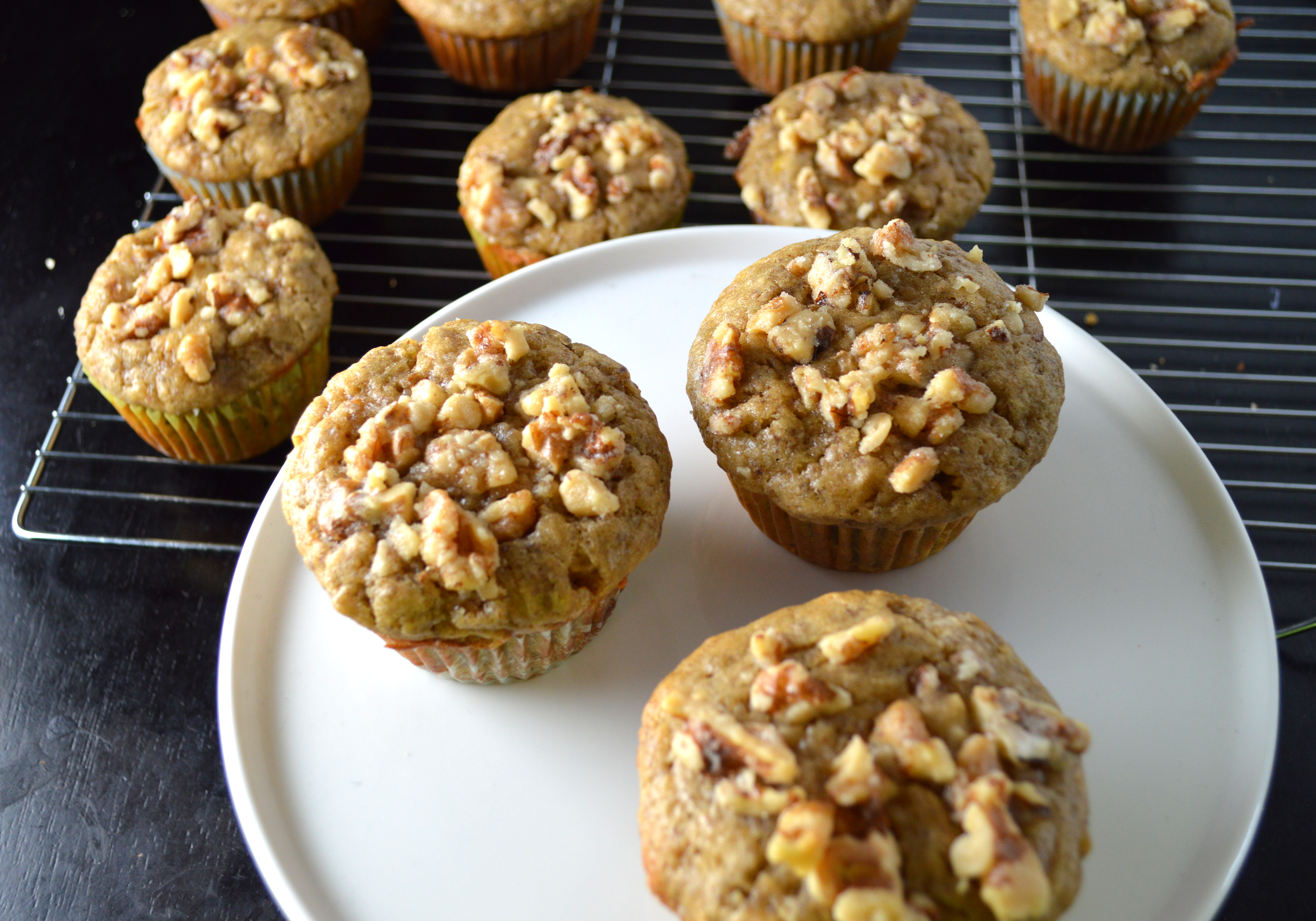 Next up is my favorite part… the walnut topping! Seriously it is so delicious and completely makes the recipe. This was not originally in the cooking light recipe so I added it. My mom likes to add this topping to boxed muffin mixes. It makes them extra special. Simply combine the walnuts, brown sugar, flour, salt, and butter with your fingers. Sprinkle the topping on each muffin and you are done.