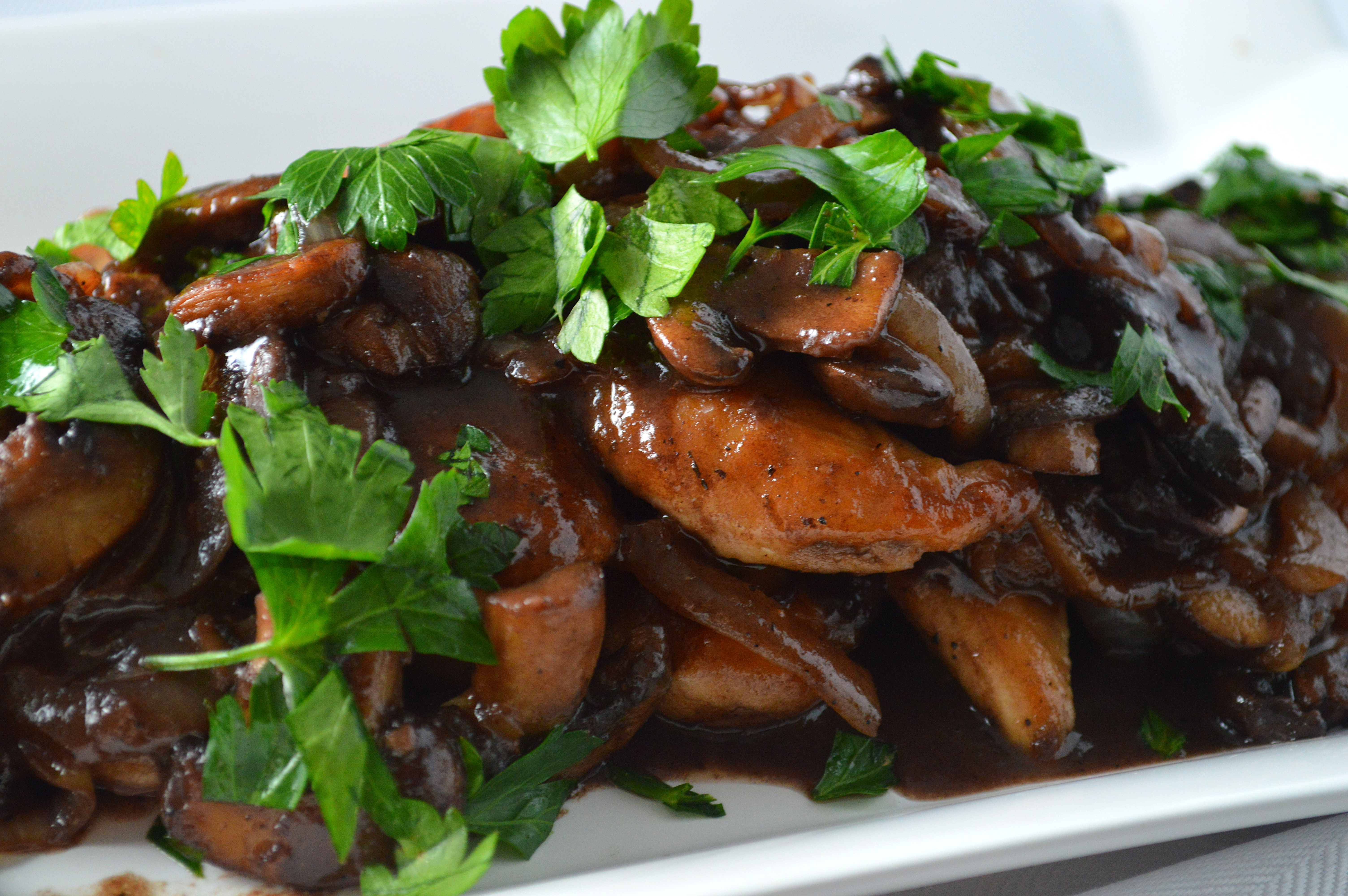 Return the chicken and mushrooms to the pan and let cook a minute or two. Garnish with chopped parsley. Enjoy!