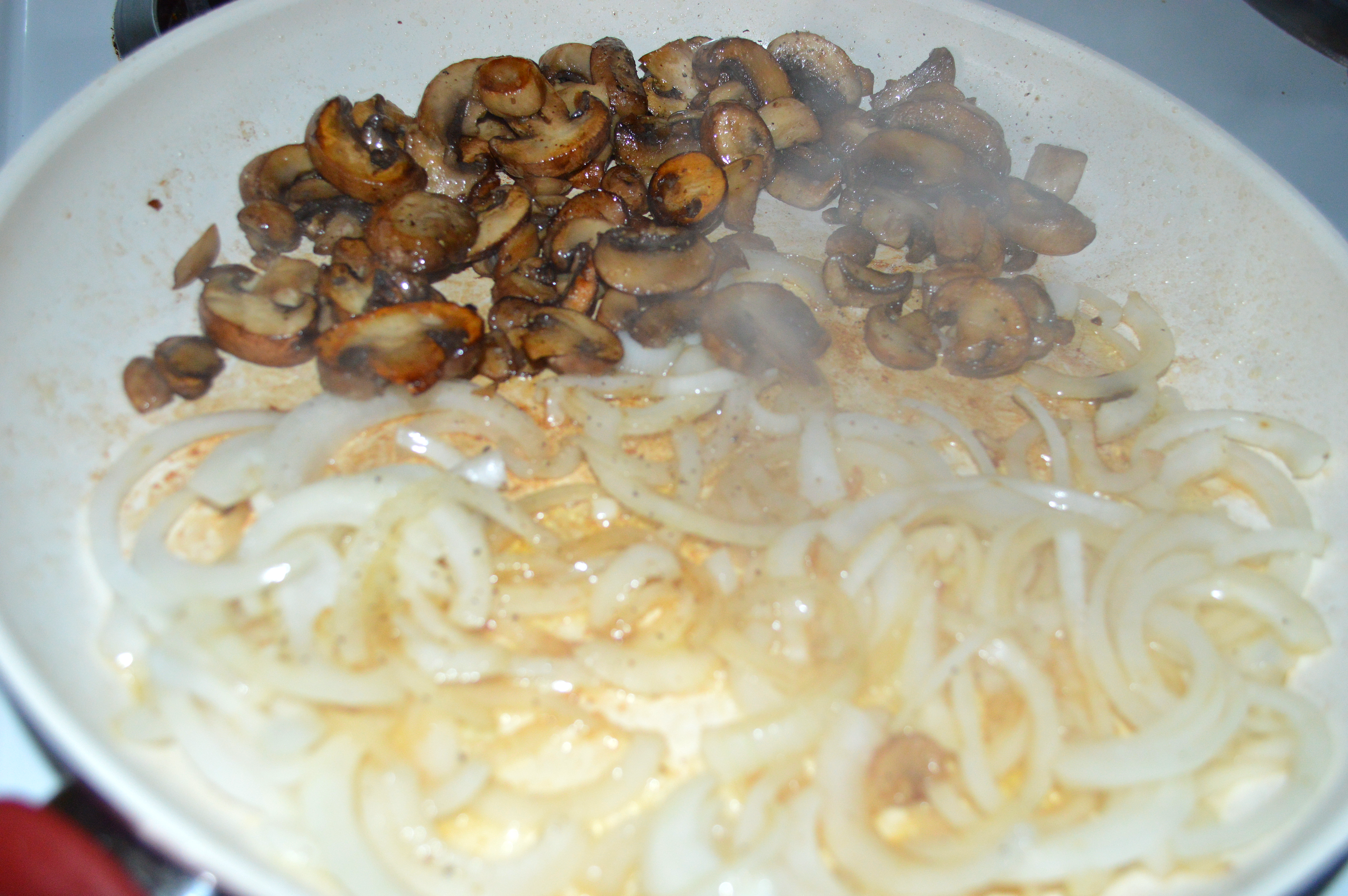 1. Heat a large skillet to high heat. Add a drizzle of olive oil and mushrooms. Sauté, stirring occasionally, until the mushrooms turn a golden brown color. This should take about 5-10 minutes. Scooch the mushrooms over to one side of the pan, add another drizzle of olive oil if needed, and add the onions. Season with salt and pepper. Saute until soft and starting to caramelize. Remove the mushrooms and onions from the pan.