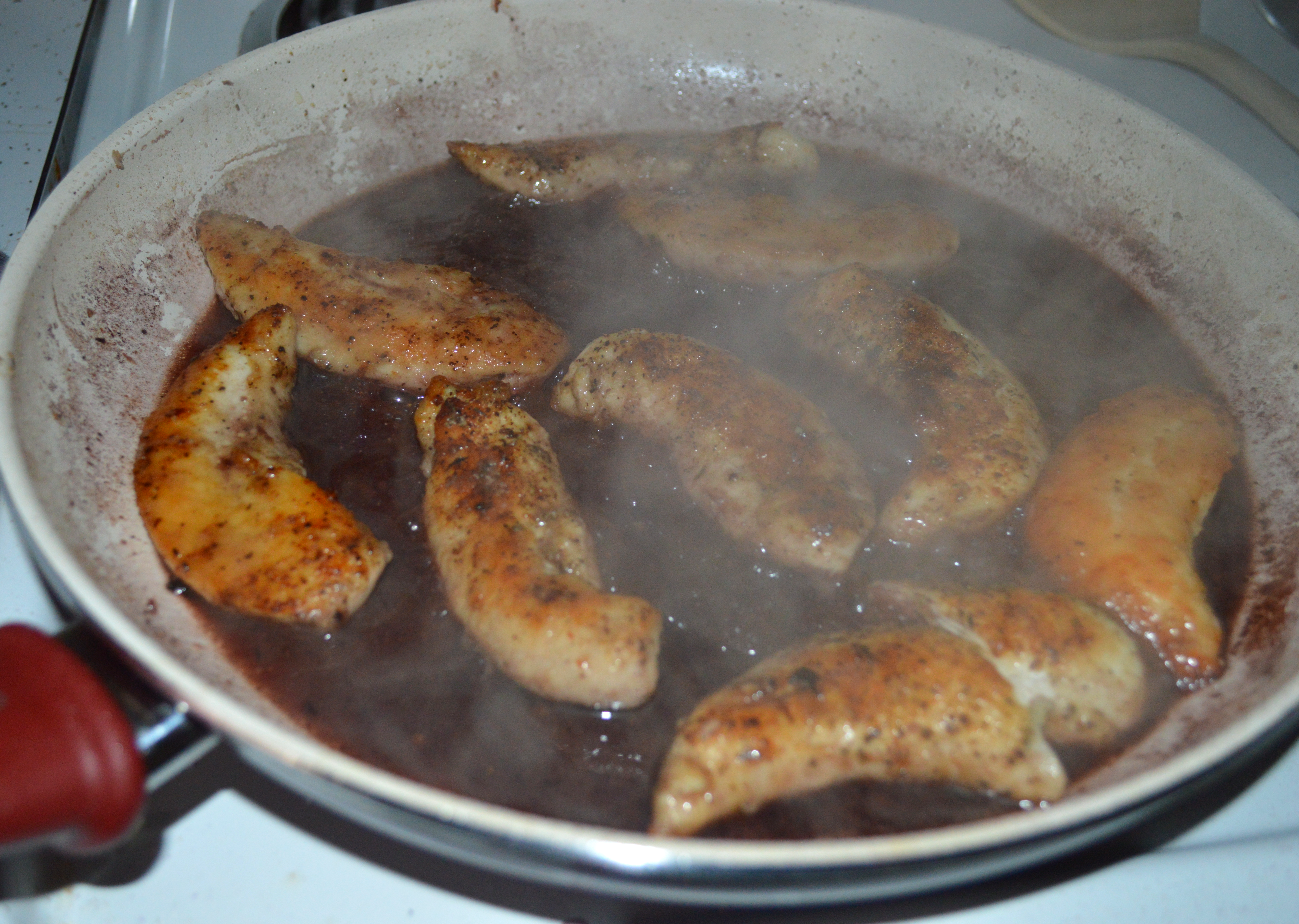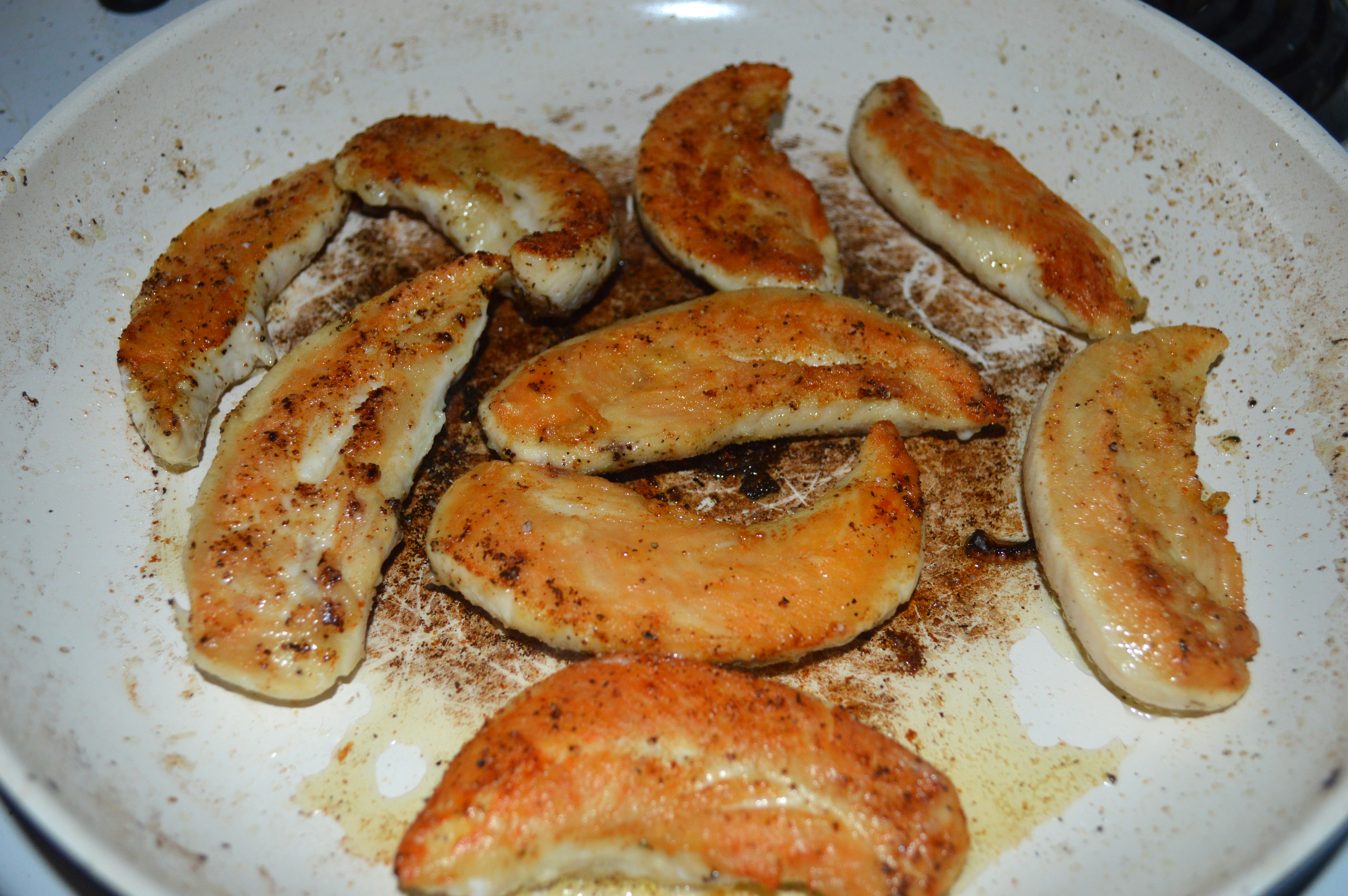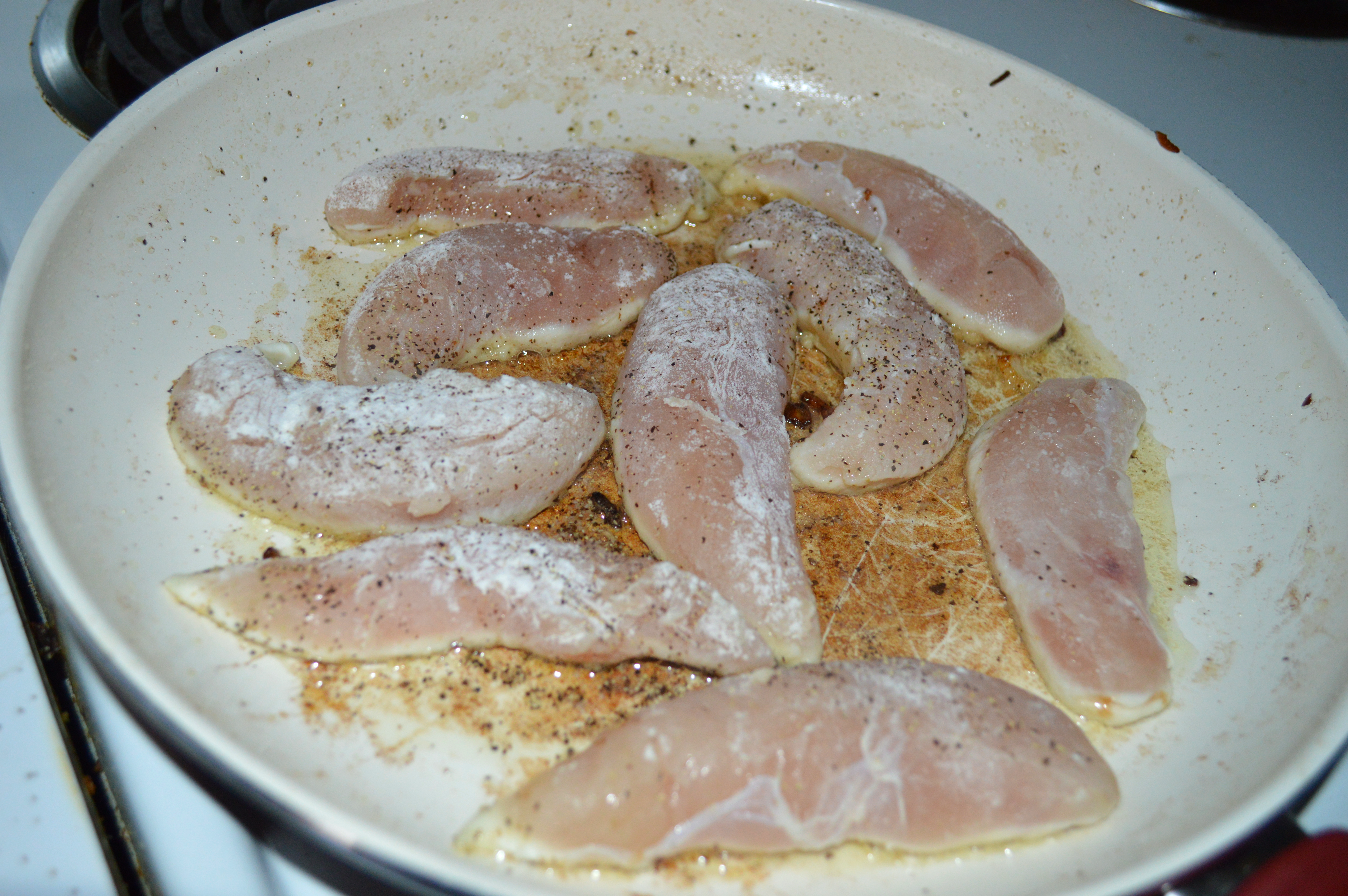 2. Lower heat to medium. Sprinkle the chicken tenderloins with salt, pepper, and flour. Shake off the excess flour. Drizzle the pan with a little more olive oil if it has dried out. Add the chicken and cook until golden brown and cooked through. Remove from pan.