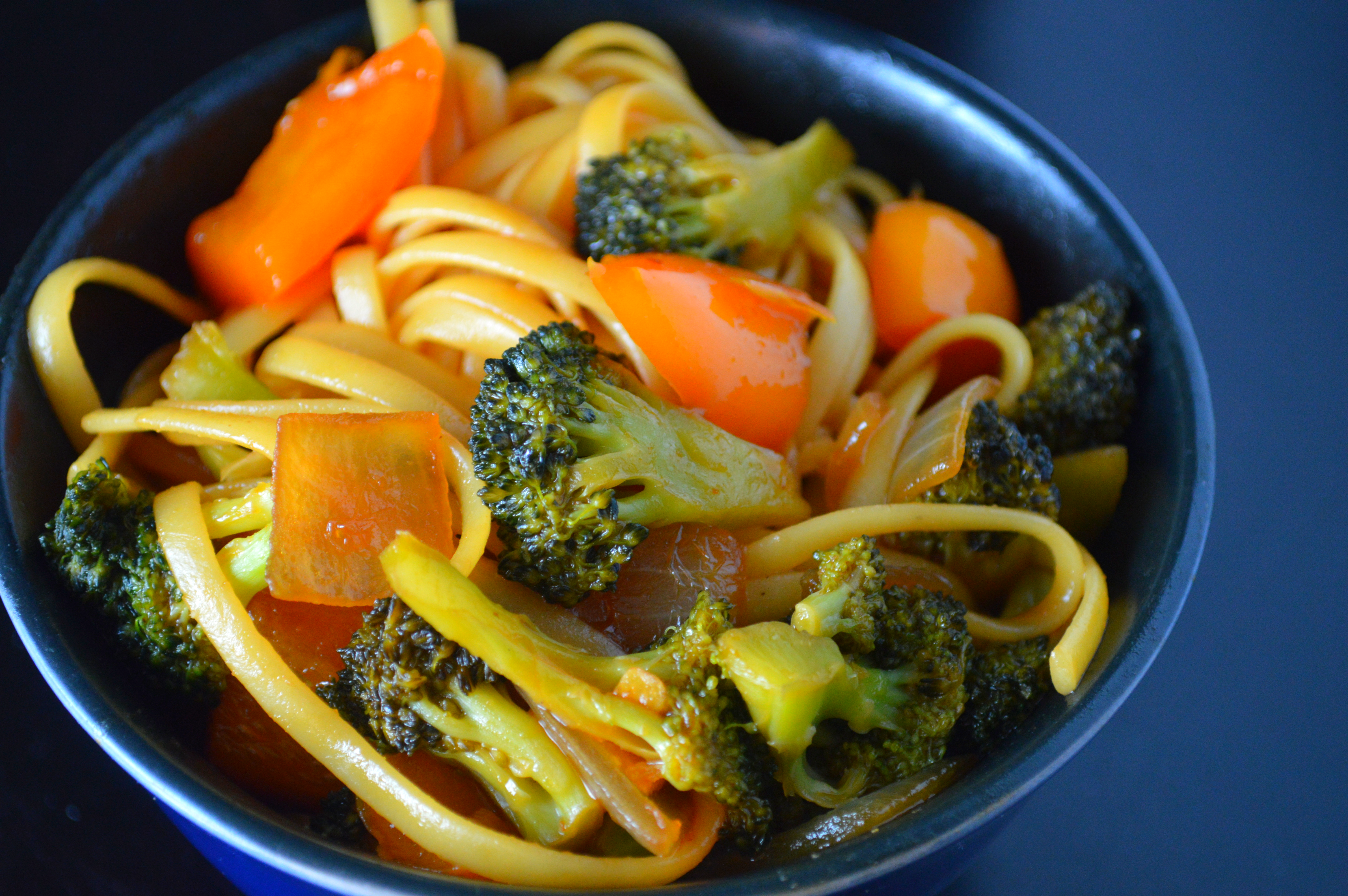 My biggest tip for making Chinese food at home is to have everything ready before your begin cooking. Mix up your sauce, chop all of your veggies, and have your water boiling. Unless you have some mad Iron Chef chopping skills (kudos to you if you do) you won’t have time to chop while you go. I also really like using leftover steamed or blanched broccoli in this recipe. Of course you could boil it for a couple of minutes before cooking your pasta .